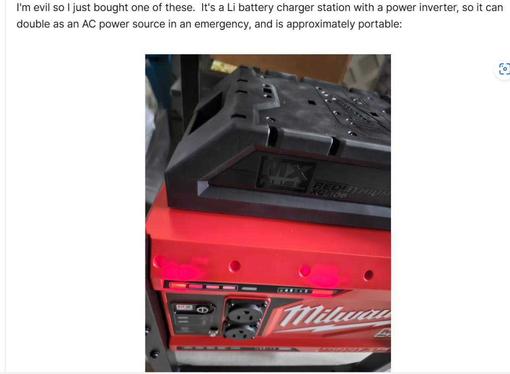 It’s basically a power inverter so it does what solar panels (PV) can do your roof only with an Li Ion battery, and you need the grid to charge it up. First world to next world buffering device. It is more or less a Tesla you can carry, without the transportation parts. In the above pic, you see one of two possible batteries charging. It takes about 90 min per battery to charge, one at a time. Then you can use the batteries for whatever the power is rated for.