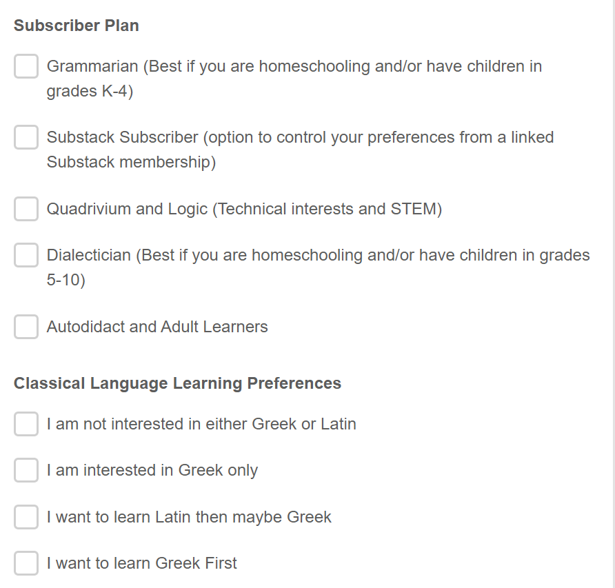 - If you are interested in free materials and course announcements related to Classical Languages (Latin and Greek), or you are educating young children, select the Grammarian Plan.